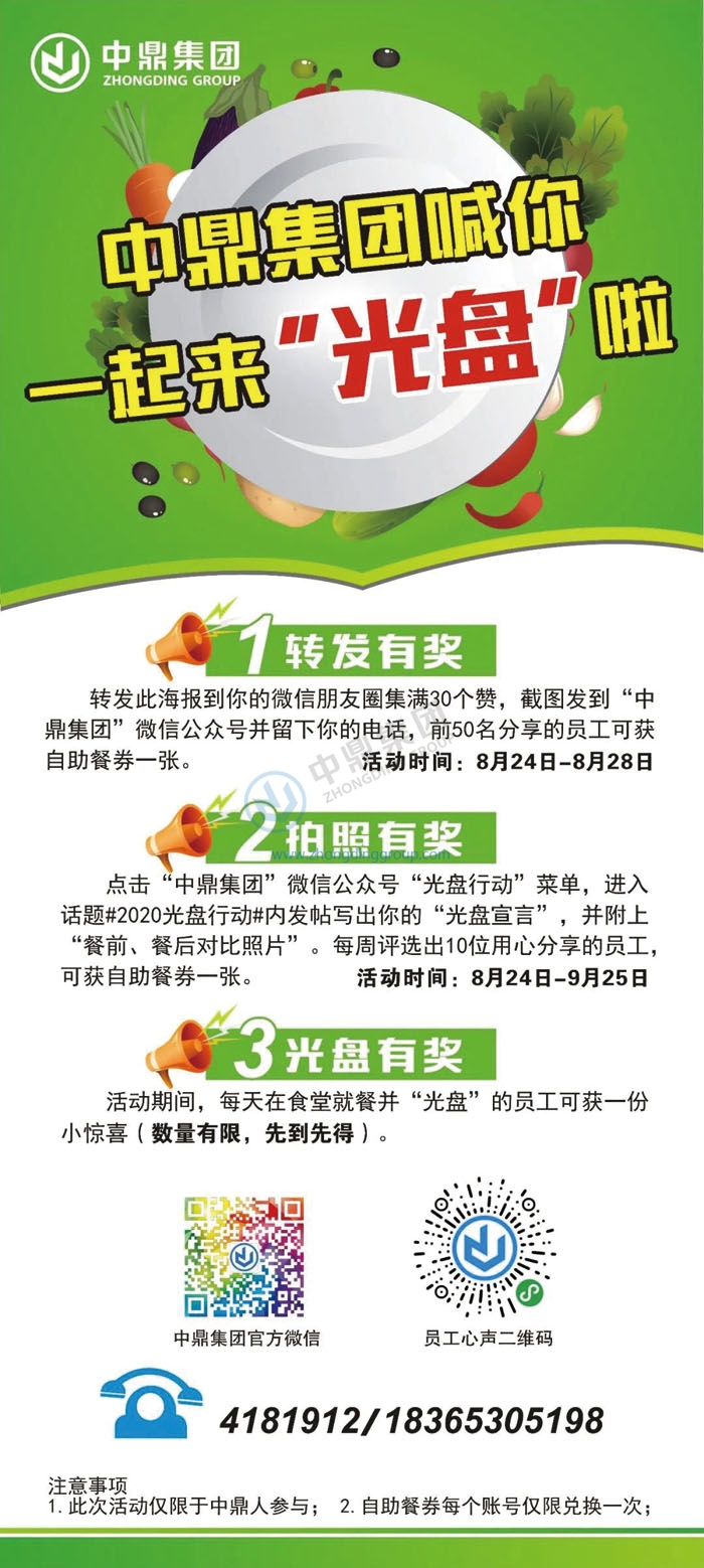 為迅速營造活動氛圍,強化宣傳效果,集團工會聯(lián)合生活服務(wù)公司,策劃開展了“品嘗舌尖上的美味,拒絕舌尖上的浪費”活動,利用中鼎官微宣傳造勢,通過“拍照有獎”“光盤有獎”“轉(zhuǎn)發(fā)有獎”的獎項設(shè)置,鼓勵廣大員工積極參與“光盤行動”。同時,為配合活動開展,團委還安排志愿者擔任勸導員,引導員工文明就餐,減少浪費。此舉立即掀起“光盤”熱潮,據(jù)生活服務(wù)公司初步統(tǒng)計,自活動開展以來,每天收集的泔水較前期減少了三分之二。另據(jù)相關(guān)預計,若堅持一年,公司寧國境內(nèi)四個食堂一年可節(jié)約30000斤大米。