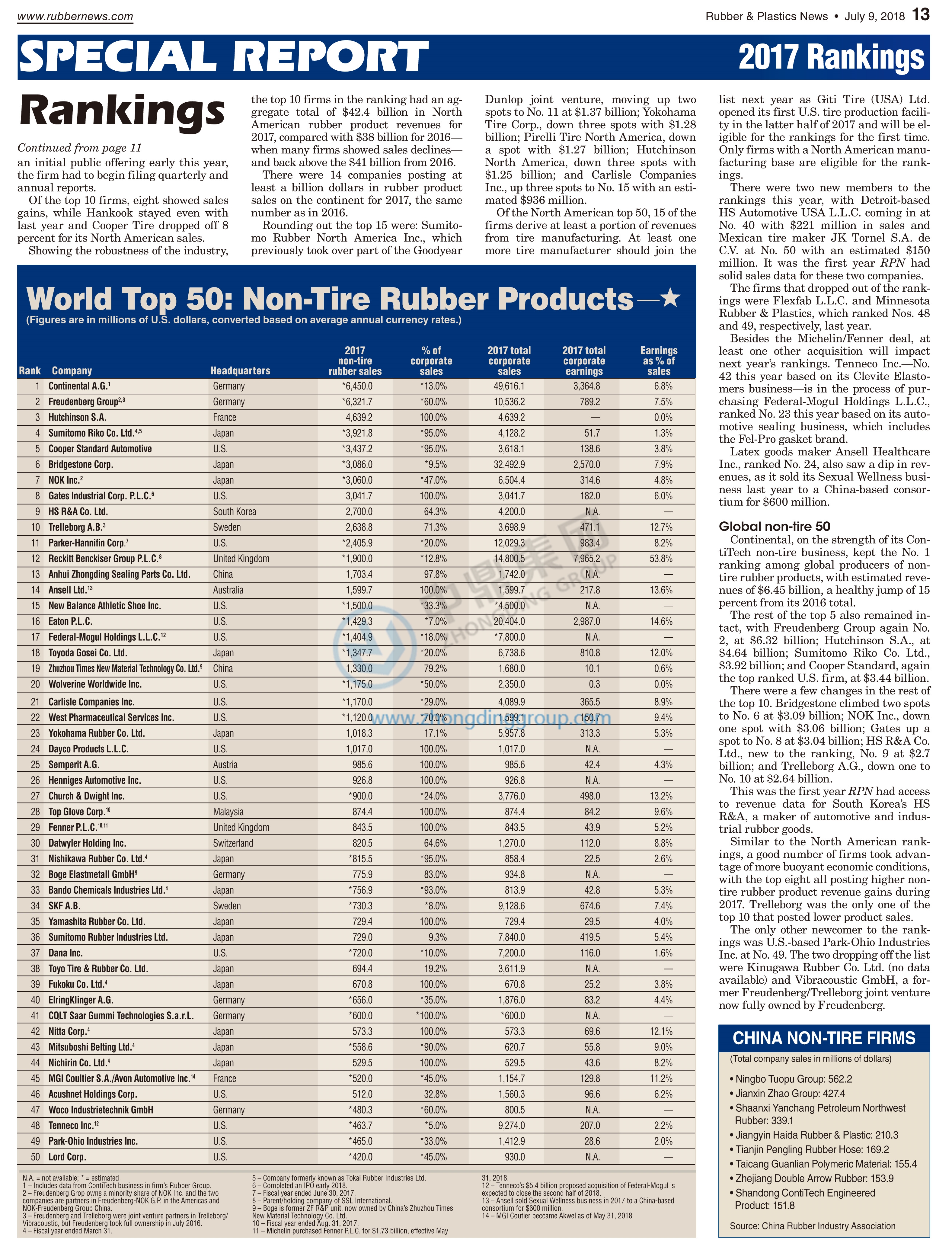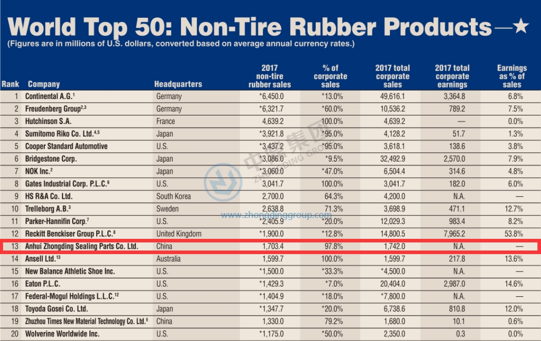 Recently, in the United States, “The Rubber & Plastics News" magazine published the 2018 global non-tire rubber products, Top 50. Zhongding has risen again from 17th in 2016 to now 13th overall in the world.